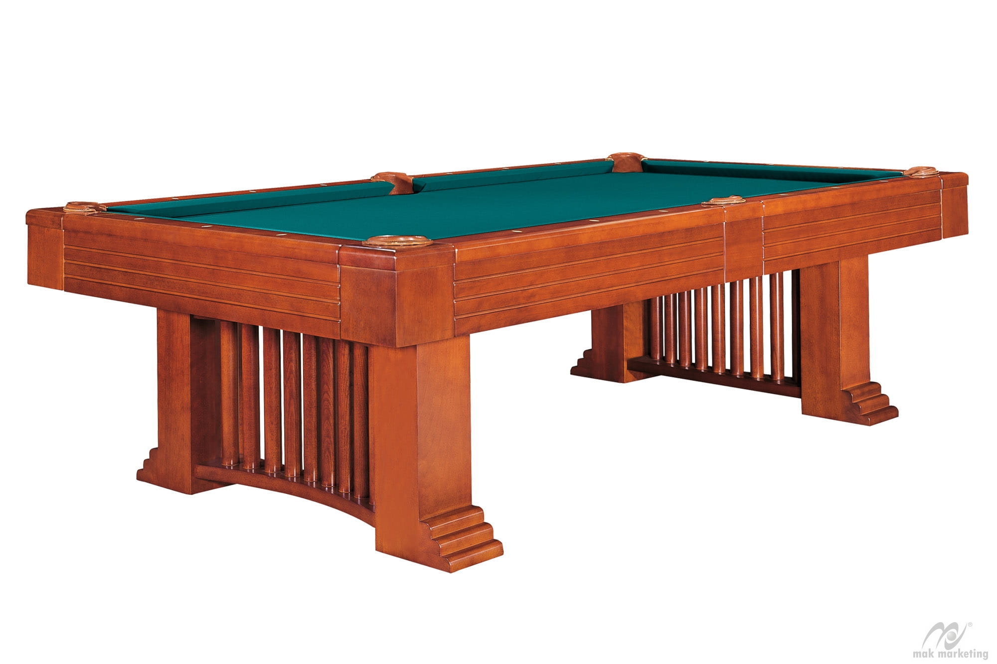 Stół bilardowy.Idealny do klasycznych ciężkich wnętrz. Stół o stylistyce dominującej przed wiekami. Podobne do niego stoły znajdowały się w pałacach i rezydencjach. Boki i bandy wykonana z płyty pilśniowej powlekanej, a korona i nogi z drewna brzozowego. Bandy D.B.O., kosze przy łuzach wykonane ze skóry, a płyta do gry Rasson 3-częściowa kamienna o grubości 2 cm.